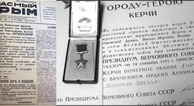 Первая весть об освобождении и награда Керчи. Фотоколлаж автора. Официально он, золотой, - высшая награда тогдашнего Советского Союза, медаль «Золотая Звезда» и почётное звание «Город-герой», появились в приморском крымском регионе полвека назад - по указу Президиума Верховного Совета СССР. Память обо всех выстоявших в Великую Отечественную, о погибших, замученных фашистами, о защитниках и освободителях… А приехавший из Луганска в Крымскую филармонию мальчишка военной поры Юрий Иосифович Богатиков подарил городу и полуострову песню, ставшую своей для многих, знающих цену войны и мира. Слова песни написал тоже ребёнок войны Феликс Янович Лаубе, а музыку генерал-майор милиции Алексей Гургенович Экимян, в войну подростком работавший на восстановлении Харькова. «Догорает над Керчью закат,/ Ночь черна, как матросский бушлат,/ Звёздный блеск - словно вспышки ракет/ Тех далёких и огненных лет./ И горит Золотая Звезда,/ Ей над городом вечно светить!/ Эх, была бы живая вода, / Чтоб погибших ребят разбудить/ Надышаться бы им допьяна,/ Да взглянуть на Отчизну свою,/ Да узнать, как прекрасна она,/ Жизнь, добытая ими в бою.». В боях. Неимоверно тяжёлых: четырежды через Керчь проходила линия фронта в Великую Отечественную, город испытал две оккупации. Не забываем! Долгожданное… О том, что у полуострова официально появился второй (после Севастополя) город-герой, наша газета рассказала читателям 15 сентября 1973-го, опубликовав тот указ: «За выдающиеся заслуги перед Родиной, массовый героизм, мужество, стойкость, проявленные трудящимися Керчи, и воинами Советской (Красной) Армии, Военно-морского флота и авиации в годы войны, и в ознаменование 30-летия разгрома фашистских войск при освобождении Керчи присвоить городу Керчи почётное наименование «Город-герой» с вручением ордена Ленина и медали Золотая Звезда». Правда, вручили не сразу - ровно через год это сделал министр обороны СССР Андрей Антонович Гречко, приехавший в Керчь в сопровождении бывших фронтовиков, в том числе Владимира Васильевича Щербицкого, первого секретаря ЦК Компартии Украины и Николая Карповича Кириченко, первого секретаря Крымского обкома партии. Для министра Крым не был чужим - воевал на полуострове ещё в Гражданскую, в Великую Отечественную в 1943-м вёл как командарм 56-ю армию (будущую Отдельную Приморскую) на освобождение - в середине октября генерал-полковника перевели на 1-й Украинский фронт, а спустя неделю армия участвовала в Керченско-Эльтигенском десанте. Редактор нашей газеты Владимир Александрович Бобашинский, мальчишка военной поры, помнящий, что такое фашистская оккупация, вспоминал, как радостно встречали керчане долгожданных гостей, а все крымчане - добрую весть. Бои за Керчь были тяжёлыми, а к освобождению 11 апреля 1944-го город оказался практически полностью разрушенным, фашисты уничтожили почти все дома, все предприятия, электростанцию, взорвали железнодорожные пути, сожгли мосты… Но самое невосполнимое - людские потери: десятки тысяч павших в борьбе за город, 14 тысяч жителей угнаны на работы в Германию, многие там погибли. А в самом городе-пригородах более 15 тысяч человек уничтожено; лишь в Багеровском противотанковом рву более 7 тысяч осталось. В январе 1942-го наш фронтовой фотокорреспондент Леонид Исаакович Яблонский снимал там страшные кадры для истории - сни