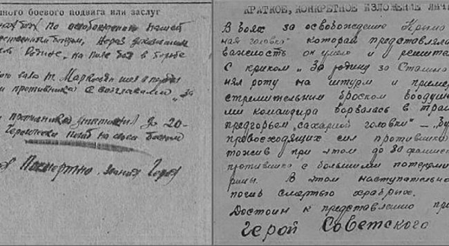 Если судить о дате совершения подвига и указании, что погиб в том бою, то верно Донесение о безвозвратных потерях дивизии от 30 декабря 1943-го: «погиб 6 ноября 1943-го, первичное место захоронения - Николаевская область, Каховский район, с. Перекоп, юго-западная сторона». Но есть Донесение о безвозвратных потерях от 23 февраля 1944-го, где указано, что Аваг Маркосьян «погиб 2 февраля 1944 года, первичное место захоронения - Крымская АССР, Красно-Перекопский район, с. Хаджимурат, восточнее 103 км, отметка 11/о, севернее