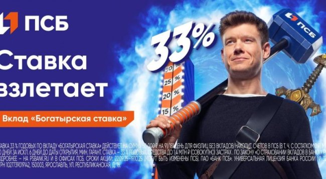 Фото ПСБ. ПСБ предложил новым клиентам вклад «Богатырская ставка» с доходностью 33%* годовых. Депозит можно открыть на сумму 50 000 рублей сроком на 3 или 6 месяцев до 19 октября 2025 года включительно. Доход выплачивается ежемесячно на счет клиента. Предложение действует для клиентов, которые за последние полгода не хранили средства на накопительных счетах в ПСБ и не имели действующих и закрытых вкладов и накопительных счетов в банке. «Депозит - это инструмент, который защищает от инфляции и позволяет получить дополнительный доход. Сберегательные продукты ПСБ пользуются стабильно высоким спросом у крымчан, и мы со своей стороны рады предложить нашим клиентам новый вклад с одной из лучших на рынке процентных ставок. Он будет особенно привлекателен для формирования начальных накоплений», – отметила Светлана Сидорова, управляющий Крымским филиалом ПСБ. Вклад «Богатырская ставка» можно открыть в любом отделении ПСБ, а также в мобильном приложении или интернет-банке. *Ставка 33% годовых по вкладу «Богатырская ставка» действует для суммы 50 000 руб. на срок 91, 181 дней для новых вкладчиков, не имевших в банке действующих срочных вкладов и (или) накопительных счетов (в т. ч. с нулевыми остатками) в течение 180 дней, предшествующих дате открытия вклада «Богатырская ставка» (за исключением даты открытия вклада «Богатырская ставка» и 6 календарных дней предшествующих дате открытия вклада «Богатырская ставка»), а также срочных вкладов и (или) накопительных счетов, закрытых в дату открытия вклада «Богатырская ставка» и в течение 180 дней, предшествующих дате открытия вклада «Богатырская ставка». Выплата процентов ежемесячно на иной счет клиента, открытый в банке. Минимальная гарантированная ставка — 33% годовых. Сроки акции: 22.09.2025 - 19.10.2025 г. Денежные средства по совокупности вкладов и остатков на счетах физлиц застрахованы в пределах 1,4 млн руб. в соответствии с федеральным законом «О страховании вкладов в банках Российской Федерации». Подробная информация — на psbank.ru, по телефону 8 800 333 78 90 (круглосуточно, звонок по России бесплатный) или в офисах банка. Информация актуальна на 03.10.2025. Реклама. ПАО «Банк ПСБ». Лицензия Банка России № 3251 от 1 апреля 2025 г.