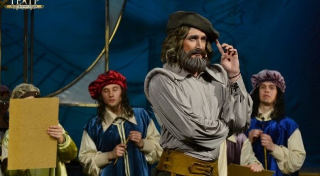 Сцена из спектакля «Леонардо». В древний русский город отправляется Государственный академический музыкальный театр. - Пять лучших наших спектаклей будут показаны 23-27 июня на сцене Липецкого государственного академического театра драмы имени Л. Н. Толстого, с которым коллектив связывает давняя дружба, - рассказывает художественный руководитель театра Владимир Косов. - Мы благодарны за предоставленную возможность Министерству культуры республики, без поддержки которого гастроли не могли бы состояться. В гастрольных спектаклях занята почти вся актёрская труппа театра, хор, балет. Коллектив надеется на успех мировой премьеры мюзикла «Человек-амфибия» по мотивам фантастического романа Александра Беляева. Музыку к спектаклю на либретто поэта-песенника Натальи Кузьминых написал известный российский композитор Егор Шашин. Любителям классической оперетты будет представлена вторая премьера сезона - «Летучая мышь». Взыскательная публика оценит мюзикл «Леонардо» известных российских авторов - композитора Кима Брейтбурга и поэта-песенника Евгения Муравьёва. Автор пьесы, он же режиссёр-постановщик, Владимир Косов перенесёт зрителей в один из старых двориков с ветхим домишком, обитатели которого много лет живут здесь одной семьёй. И вместе с артистами расскажет, что с ними произошло «В городе С» - Симферополе. Вслед за этой музыкальной комедией не менее увлекательная «Дамы и гусары» по пьесе польского драматурга Александра Фредро, которая завершит гастроли.
