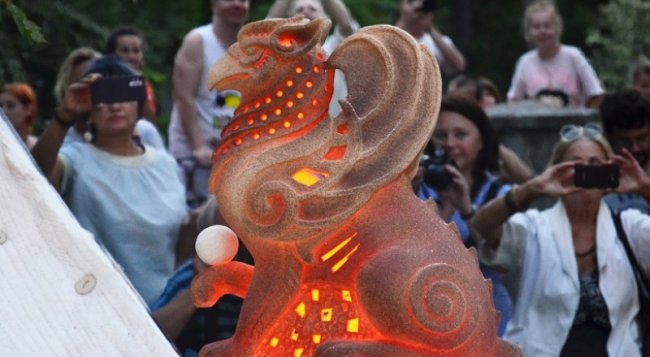 Фото Александра КАДНИКОВА. На открытой площадке Центрального музея Тавриды 26 августа из огня «родился» грифон - символ Крыма с давних времён. Керамическую скульптуру мифологического крылатого существа с туловищем льва и головой орла высотой 120 см изготовили два крымских мастера - Александр Шеханин и Александр Сопин. В центре площадки в музее установили оригинальную печь для обжига с помещённой в неё глиняной скульптурой. Обжиг происходил в вечернее время, потом «печь разверзлась», и на свет появился пронизанный светом огня красивый грифон, держащий в львиной лапе большую жемчужину, указывающую на уникальность Крыма.