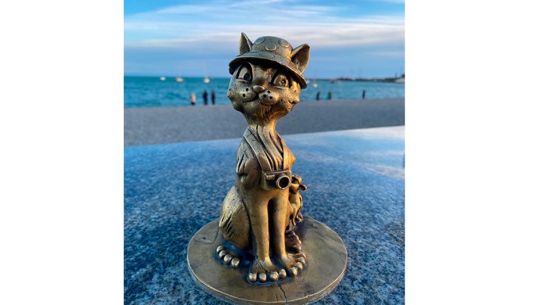 Кошечка-фотограф. Фото Виктории Струниной. Такое развлечение предлагают инициаторы установки в Евпатории забавных фигурок бронзовых мини-статуэток. И на это предложение охотно откликаются гости города. Горожане их обнаружили, конечно, первыми. А среди них - член совета республиканского отделения Всероссийского общества охраны памятников истории и культуры Виктория Струнина. - Скульптурок десять, - предварила наше совместное путешествие Виктория Николаевна. - Каждая образно олицетворяет представителя какой-то профессии. Предлагаю начать отсчёт с фигурки на набережной. Ею оказалось очарование в изящной шляпке в горошек, с украшающим грудь, как медаль, фотоаппаратом. Игривый взгляд, изящные лапки - явно фотограф-дама. Второй на нашем пути оказалась фигурка в ротонде сквера Караева. Кто это - я определить затруднилась. Моя собеседница подсказала: - Обратите внимание на лавровый венок военного триумфатора, фибулу (застёжкой) на сагуме - плаще римских солдат, защитный нарукавник, пояс с передником из ремней, украшенных заклёпками, тяжёлые башмаки - калиги. То ли воин-победитель сидит, опираясь на разрушенную колонну, то ли сам диктатор Цезарь. Уж никак не Геракл, за которого его принимают. - В поисках Кота-рыбака неужто всё побережье городское обойдём? - Думаю, не придётся. На площадь Моряков отправимся, там спокон веков рыбаки ловят на удочку ставридку, кефаль, наверняка, и там у нас «улов». Точно: возле старинного здания таможни - котик с охапкой рыбёшек. Насчитали 15. Следующую фигурку обнаружили возле Центральной городской библиотеки. - Кот-учёный - прокомментировала Виктория Николаевна. - Выразительные очки. Стопка книг, рядом часы с указанным на циферблате временем - 16.40 и цифра 2500 - возраст нашей Евпатории. По центральной улице идём-бредём, вокруг поглядываем. - Кто ж это тут в ожерелье из баранок возле ресторана «Модерн»? Не официант же? - Это офеня, или коробейник. Присел отдохнуть, пока помощники наполняют его коробок снедью на продажу. Котик-офеня чаёк попивает и предлагает прохожим баранки. Без экскурсовода в Евпатории - никуда! Отыскался и он. - Не иначе, как Леопольдом его зовут, - считает моя спутница. - Иначе, с чего бы это стоять ему в компании мышей? Кот-экскурсовод держит план крепостных ворот и рассказывает историю одного из самых древних городов мира. Туристы-мышки внимательно слушают. Седьмого четырёхлапого евпаторийца обнаружили неподалёку от бывшей Купеческой синагоги - Кота-гончара. Искать восьмую скульптурку долго не пришлось. Кто-то подсказал, что надо просто перейти дорогу от Гезлёвских ворот к Текие дервишей. Здесь мусульманские аскеты совершали ритуальные пляски под суфийскую музыку. Ритмичные звуки извлекались из дарбуки - восточного кубкообразного барабана, а играющий на нём назывался дарбукатёром. Его образ и воплощён в скульптурке. Ещё одну «музыкальную» фигурку - Кота-скрипача - обнаружили у входа на подворье Ремесленной синагоги Егия Капай, где можно подкрепиться в музее-кафе еврейской кухни «Йоськин кот» и послушать музыку. Кажется, грянет сейчас «Хава Нагила», и ноги сами в пляс пустятся. Десятого кота назвали Банщиком. А где же такому стоять, как не возле турецкой бани XVI века в Старом городе? С мыльной пеной на голове. Удобно устроился с веником в тазике с двумя ручками - шайке. - Здесь теперь не попаришься