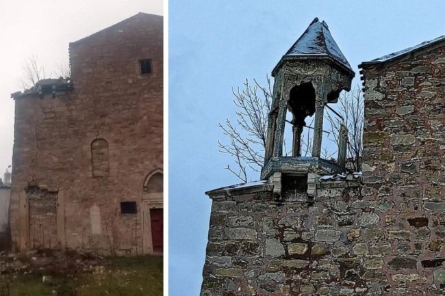 Звонница на древнем храме обветшала и обрушилась (на фото слева).
