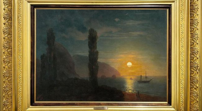 Фото Московского аукционного дома. Пейзаж «Лунная ночь в Крыму» Ивана Айвазовского выставят на торги в Москве за 60 млн рублей, об этом сообщили в пресс-службе Московского аукционного дома, передаёт ТАСС. С молотка также уйдут работы Ильи Репина, Исаака Левитана, Валентина Серова, Ивана Шишкина, Виктора Васнецова, Василия Поленова и других художников. Общая стоимость коллекции на торгах – 1 млрд рублей, причём картина уроженца Феодосии Айвазовского – самый дорогой лот. В организации отмечают, что на торгах будут представлены произведения из частных коллекций, ранее участвовавшие в выставках уровня Третьяковской галереи, а также вещи из собраний людей, «чьи имена неотделимы от истории России». В том числе, будут выставлены предметы современного искусства, декоративно-прикладного искусства и старинные иконы.