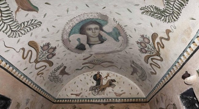 Художникам удалось добиться не только нужного состава штукатурного теста. Они также, как и мастера в древности, использовали в своей работе натуральные пигменты. На стены и свод были нанесены три слоя штукатурки. Самый нижний состоял из известкового раствора с морским песком и мелкими фракциями молотой обожжённой черепицы. Второй - из терракотовой пыли (растёртой в порошок обожжённой глины) и красной охры (красящего пигмента). Именно такой древний рецепт придал поверхности свода камеры прозрачный розовый оттенок.