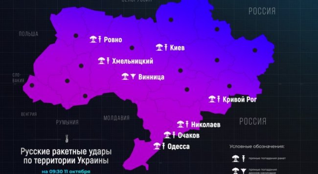 Карта зафиксированных ударов русскими ракетами по территории Украины по состоянию на 9.30 11 октября (по версии Telegram-канала «Zаставный»). День рождения командующего Объединённой группировкой войск в зоне проведения СВО Героя России, Героя ЛНР генерала армии Сергея Суровикина был отмечен продолжением ударов по военным и инфраструктурным объектам «незалежной». Сообщается о снижении украинского интернет-трафика на 75%. Польская сторона заявила о прекращении подачи электроэнергии в «незалежную», ДТЭК Рината Ахметова в свою очередь сообщил о прекращении экспорта украинской электроэнергии в Европу. Как следует из сообщений с мест, 11 октября удары российским высокоточным оружием наносились по крупным транспортным узлам в центральной и западной частях территории бывшей УССР. Накануне украинские источники сообщали о перехвате подавляющего большинства российских ракет и беспилотников, однако их победные реляции опровергаются фактами: по сообщению Минобороны России, все назначенные цели были поражены. «ПВО Украины не может перехватить большую часть крылатых ракет и БПЛА, отрабатывающих сейчас по целям на территории «незалежной». Накануне Зеленский снова потребовал от западных партнёров «закрыть небо». Байден пообещал передать Украине современные комплексы ПВО. Какие именно, когда и в каком количестве - неизвестно», - сообщает военкор ВГТРК Евгений Поддубный. Вопреки требованию главного Кулебы украинской дипломатии, западные масс-медиа назвали российские ракетные удары расплатой за теракт на Крымском мосту. Потому что так оно и есть. Европейские поборники «свободы слова» даже отошли на время от своих принципов и запустили трансляцию совещания президента России с постоянными членами Совета безопасности РФ. Так поступили в частности некоторые французские телеканалы. Президент России Владимир Путин в ходе совещания подробно и доходчиво обрисовал причины происходящего. «Данные криминалистической и других экспертиз, а также оперативная информация говорят о том, что взрыв, устроенный 8 октября, - это террористический акт, теракт, направленный на разрушение гражданской, критически важной инфраструктуры России. Очевидно также, что заказчики, организаторы, исполнители теракта - это украинские спецслужбы. Киевский режим уже давно использует террористические методы. Это убийства общественных деятелей, журналистов, учёных, причём как на Украине, так и в России. Это террористические обстрелы городов Донбасса, которые длятся уже более восьми лет. Это и акты атомного терроризма, имею в виду ракетно-артиллерийские удары по Запорожской АЭС. Но не только: спецслужбы Украины осуществили также уже три террористических акта в отношении Курской АЭС России, неоднократно подрывая линии высокого класса напряжения электростанции. В результате третьего такого теракта было повреждено сразу три таких линии. Принятыми мерами ущерб был в кратчайшие сроки ликвидирован, каких бы то ни было серьёзных последствий не допущено, - напомнил Владимир Путин. - Но совершён и целый ряд других терактов и попыток подобных преступлений в отношении объектов электроэнергетики и газотранспортной инфраструктуры нашей страны, включая попытку подрыва на одном из участков газотранспортной системы «Турецкий поток». Всё это доказано объективными данными, в т