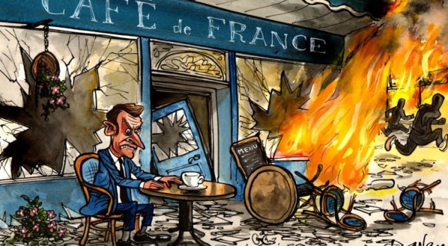 Так британская пресса глумится над Макроном. Его не жалко. Фото из открытого источника. Почему французские «обездоленные» грабят магазины, объяснять не нужно. А зачем понадобилось осквернять мемориал жертвам Холокоста, которых французская полиция арестовывала и передавала немецким палачам, а после войны чудом уцелевшим жертвам французские власти отказались возвращать занятые французами квартиры? При чём тут релоканты, рванувшие не с ЦАХАЛ воевать на стороне палестинцев, а подъедаться среди кяфиров? Они не за веру и не за нацию. Они никакие не пролетарии. Они международные жлобы-паразиты. А повод громить, убивать и грабить (в том числе других паразитов) всегда найдётся. Французский журналист и общественный деятель Дмитрий Де Кошко считает, что во всём виноват многолетний кризис системы бесплатного образования и социальных гарантий. Образование становилось всё менее и менее доступным для обитателей «мигрантских» районов, менялась и сама его суть. Если прежде целью было воспитать гражданина страны, приоритеты постепенно менялись под влиянием принципов «инклюзивности», «толерантности» и прочих новомодных «ценностей». Социальные гарантии тоже поступательно сокращались. Мало того, власти ещё и стимулировали полицию к жёстким мерам в отношении тех, кого Франсуа Олланд (социалист!) презрительно называл «беззубыми». А с другой стороны, под лозунгами «толерантности» и «либерализма» последовательно сокращались права и полномочия самих силовиков. «Это этническая, расовая война, мы видим, кто в неё вовлечён. Я думаю, что нужен кто-то с решительной и твёрдой позицией. Если бы я был у власти, я бы сначала остановил потоки мигрантов, я бы ликвидировал право на гражданство по рождению на французской земле, я бы остановил воссоединение семей. Я бы приструнил бунтующих студентов, я бы выслал правонарушителей, - заявил каналу Europe1 экс-кандидат в президенты Пятой республики Эрик Земмур. - У полицейских большая нагрузка, и я думаю, что им приказано не вступать в контактный бой. Я знаю это». Поздно. Политолог и публицист, президент Института Ближнего Востока Евгений Сатановский справедливо замечает, что расхожие формулы «увидеть Париж и умереть» и «мне в Париж по делу срочно» приобрели, мягко говоря, двусмысленный оттенок. Наши былые романтические представления о Париже, Франции и вообще Европе разрушены самими европейцами. «Символ её сегодня - погром, а лицо литературы - «Шарли Эбдо», - констатирует Евгений Сатановский. - Анархия, доведённая до логического абсолюта, когда она уже никакая не «мать порядка», а именно то, чем на самом деле и является: война всех против всех, куда более бессмысленная и беспощадная, чем пресловутый «русский бунт». Впрочем, вспоминаешь Виктора Гюго с его «Отверженными» и успокаиваешься. Это и есть настоящая Франция, страна, в которой как революция в конце XVIII века началась, так до сих пор и продолжается. Страна бунтов, багетов и лаванды». Нынешние погромы часто сравнивают по масштабам с аналогичными этнокультурными столкновениями 2005 года. Теперь тревожные цифры куда больше. Происходящее сегодня - свидетельство того, что уроки 18-летней давности не были выучены властью. После свержения де Голля, боровшегося за «отделение от Алжира», поток мигрантов не иссякал. Европейские способности к примирению представителей р
