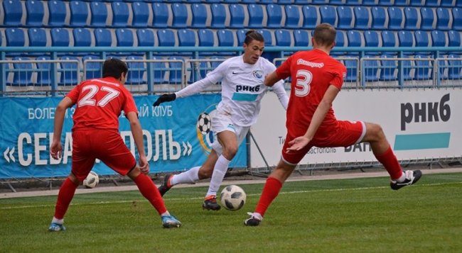 С мячом один из лидеров соперничества бомбардиров первенства КФС севастополец Артур Айметдинов. Не будем спешить с выводами, но, кажется, после крайне неудачного старта в шестом профессиональном первенстве Крымского футбольного союза начинает набирать боевую форму многолетний лидер нашего футбола симферопольская «ТСК-Таврия», значительно обновившая свой состав, прежде всего за счёт молодых игроков. И если их первая победа после шести в ряду поражений над феодосийским «Фаворитом» не оставила особого впечатления, то следующий успех в поединке с действующим чемпионом КФС «горожанами» из Евпатории уже продемонстрировал, что кропотливая работа по возрождению коллектива главным тренером Анатолием Скворцовым начинает давать плоды. И, конечно же, всех волновал вопрос, а как проведут столичные футболисты встречу с единоличным лидером нынешнего первенства молодёжненской «Крымтеплицей»? Ведь не секрет, что по своему составу, материальному положению, наличию уютной тренировочной базы они на ряд пунктов продолжают превосходить первого чемпиона КФС. Следует отметить, что первый тайм этой игры прошёл со зримым преимуществом лидера, оставившего «хозяевам поля» редкие возможности для быстрых, и, что было заметно, осмысленных контратак. И под занавес тайма одна из них привела к опасному штрафному удару по воротам Никиты Колесова. Последовала подача мяча в штрафную площадку «тепличников» и экс-коуч команды из Молодёжного Антон Монахов, как и в минувшем первенстве, забил решающий мяч в ворота своих бывших подопечных, правда, на этот раз головой - 1:0. А вот второй тайм уже проходил в равной борьбе, и хотя атаку лидера возглавлял залечивший травму спины опытный Асламбек Сикаев и группа ударных хавбеков, но пробить молодого стража ворот симферопольцев Данилу Фролова они так и не смогли. Разумеется, добрые слова следует вновь сказать в адрес 38-летнего капитана «таврийцев» Антона Монахова, который смог умело руководить своими партнёрами по обороне. Очень жаль, что за этим поединком в субботний день наблюдали лишь 80 зрителей, а сотни симферопольских поклонников футбола в нынешнем первенстве лишены возможности в столице посещать футбольные матчи. И не коронавирус служит этому заслоном. Дело в том, что так и не завершена реконструкция бывшего стадиона «Локомотив», хотя сейчас он гордо именуется базой по подготовке олимпийцев, которые если и будут в ближайшее время в Крыму, то их можно будет сосчитать по пальцам одной руки. Ну а стадион «Фиолент», который возводился всем городом ещё с двадцатых годов прошлого века, сейчас заводская собственность, и его руководство не устраивает сумма, которую выделяет Крымский футбольный союз на проведение каждого матча. Стадион требует более крутого взноса, а на это денег нет ни в КФС, ни в клубе. Вот и приходится играть в Новопавловке, на стадионе, с которого даже нельзя проводить трансляцию, отсутствует интернет, да и с мобильного телефона никуда не дозвонишься. И что удивляет, такое положение дел в столице республики не волнует наше Министерство спорта и его городское подразделение, которое даже не проводит первенство Симферополя по футболу. Поражение «Крымтеплицы» вдохновило севастопольских «горожан» побороться с «тепличниками» за неформальное звание «осеннего чемпиона», но для этого ребятам 