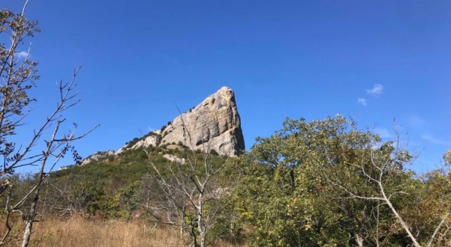 Гора выглядит высокой, но вполне доступной. Это не так. Фото автора. Недалеко от сёл Курортное и Краснокаменка, под Коктебелем, есть гора, которую хорошо видно с дороги. Очертания у неё расплывчатые, особо и не скажешь, на что похожа. Местные уверяют - виден там силуэт мужчины. А почему так - объясняет древняя легенда. Старожилы рассказывают, что когда-то в селе недалеко от Карадага жила прекрасная девушка. Отец её, Муслядин, держал отару. И был у него чабан, который лучше всех справлялся со своей работой, молодой парень Усейн. Так был доволен Муслядин работой своего подчинённого, что даже пообещал ему отдать дочь. Чабан такой чести обрадовался, да и девушка была хороша. Но вот беда - влюбилась она в другого, Рефеджана. И так случилось, что в один из дней юноша разбился. Причём случилось это, после того как Усейн узнал, что сердце Эмнэ отдано другому. Когда ему сообщили о трагедии, он лишь ответил: такова судьба. Конечно, люди стали подозревать чабана в том, что он устранил соперника. Но пылкий влюблённый не обращал внимания, он решил жениться на девушке. Она, в свою очередь, выдвинула условие: пусть поднимется Усейн на гору, с которой упал Рефеджан. Если так сделает, то согласится стать его женой. И поклялся Усейн, что если не влезет на скалу, то сам станет скалой. Начал он свой путь на закате солнца, а потом и пропал. Никто его не видел. Только стали поговаривать, что превратился он в огромный камень. Сказка - ложь, да в ней намёк. Понять Усейна можно, ведь со стороны кажется, что действительно можно забраться на скалу, любоваться окрестностями и ни о чём не волноваться. На самом деле, всё не так. Стоит только начать путь, как станет понятно, что лёгким он не будет. Забираться на скалу Курбан-кая, которую обычно зовут «Спящей красавицей», лучше со стороны виноградников. Этот маршрут более витиеватый, но зато пологий. Если подниматься со стороны родника, то придётся минут десять буквально вползать на гору. Кстати, воду в роднике обязательно стоит набрать перед походом. Местные жители говорят, что делают так регулярно, а вода почти целебная. Виды с Курбан-кая заслуживают восхищённых вздохов. Фото автора. Альпинисты эту гору очень уважают, относятся к ней настороженно. Они понимают, что просто так залезть не удастся. Отвесные склоны Курбан-кая покорятся только профессионалам. Кстати, тут часто проводят тренировочные восхождения. Хотя есть и другой маршрут - через заросшие лесом разломы. Только вот тропы нет. Придётся брести практически интуитивно. Для неопытных туристов это настоящее испытание, не стоит рисковать. Зато можно подняться под скалу, посидеть на траве и полюбоваться прекрасными видами. Они отсюда открываются в сторону Карадага, хорошо видно море, посёлок Курортное. Почти в любое время года можно порадовать себя красотой крымской природы. Кстати, гора Курбан-кая интересна с археологической и ботанической точек зрения. Например, исследователи отмечали, что вершина горы и яйлы полуострова имеют схожий покров. Кроме того, археологи нашли на склонах остатки многослойного поселения, где определили таврские, скифские и сарматские артефакты. Когда-то на горе было и поселение периода средневековья, поэтому там до сих пор есть родник с оборудованным водосбором. Кстати, мы заметили недалеко от горы следы поселения. Местные жители говорят, что когда-