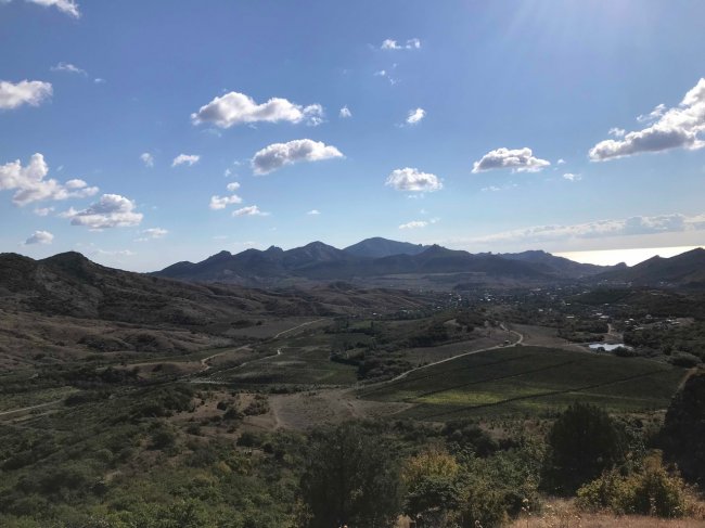 Зато можно подняться под скалу, посидеть на траве и полюбоваться прекрасными видами. Они отсюда открываются в сторону Карадага, хорошо видно море, посёлок Курортное. Почти в любое время года можно порадовать себя красотой крымской природы.