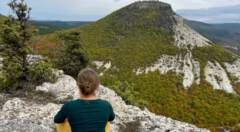 Мой путь к нему начался с горы Казан-Кая, откуда открывался захватывающий вид на окрестности. Каменные глаза так называемого Дырявого грота, устремлённые в небо, словно указали на плато Кыз-Кермен, расположенное напротив своего соседа, Тепе-Кермена.